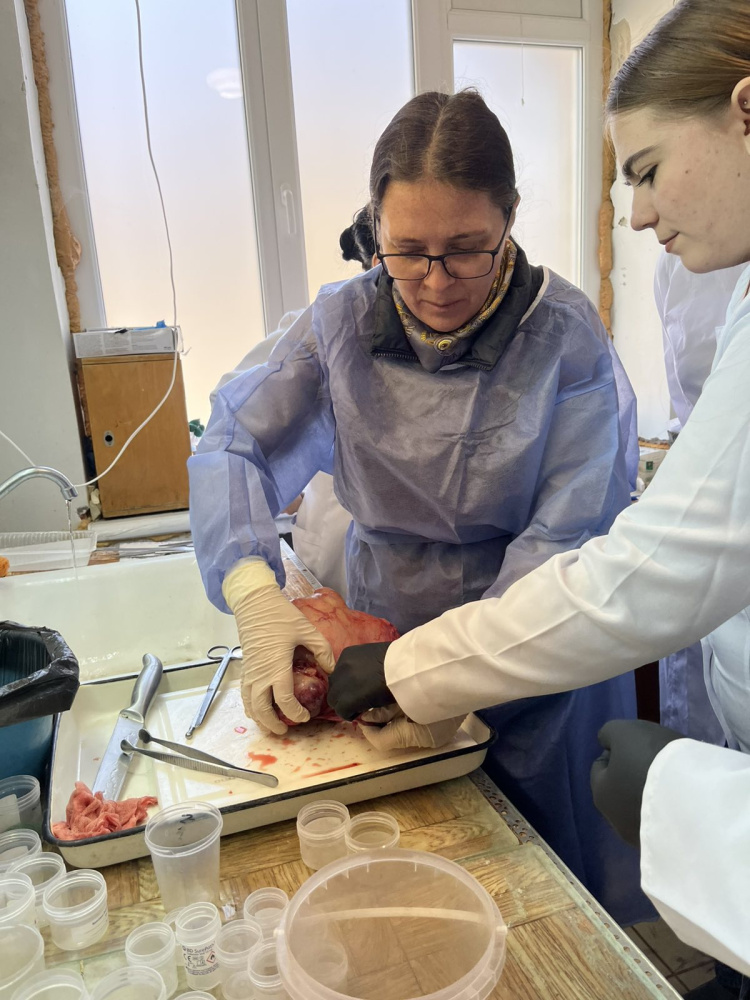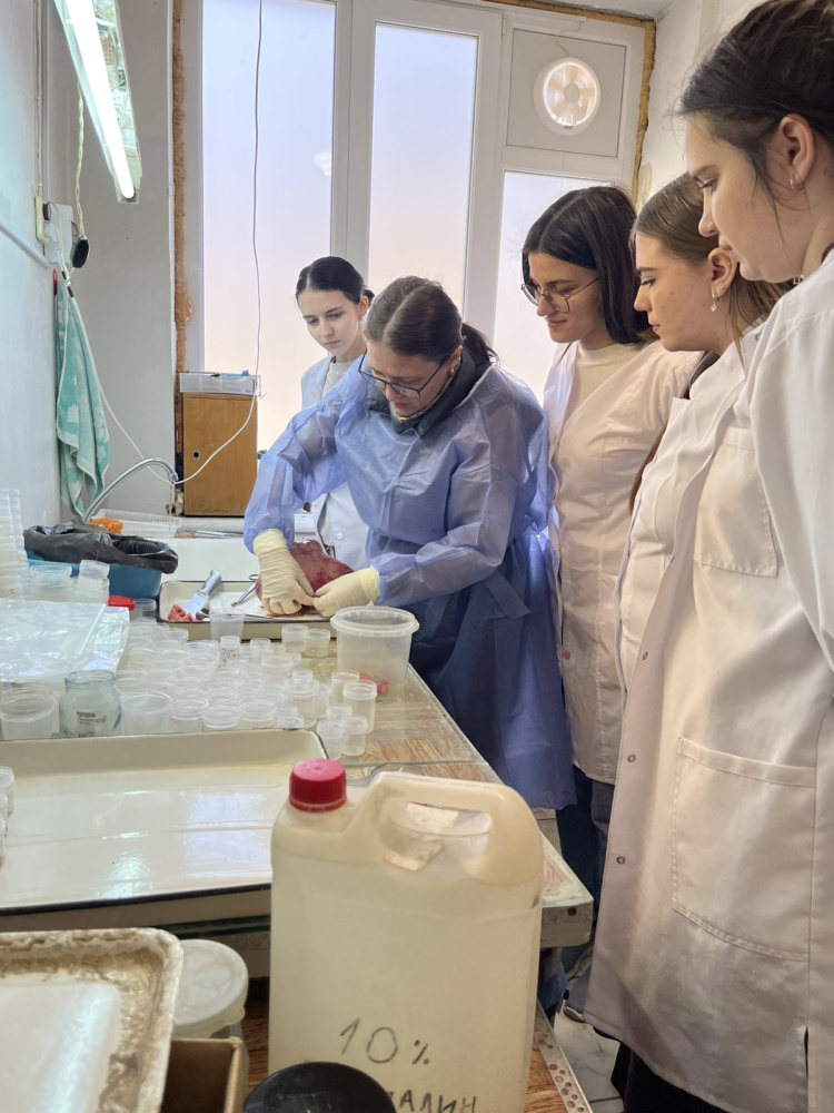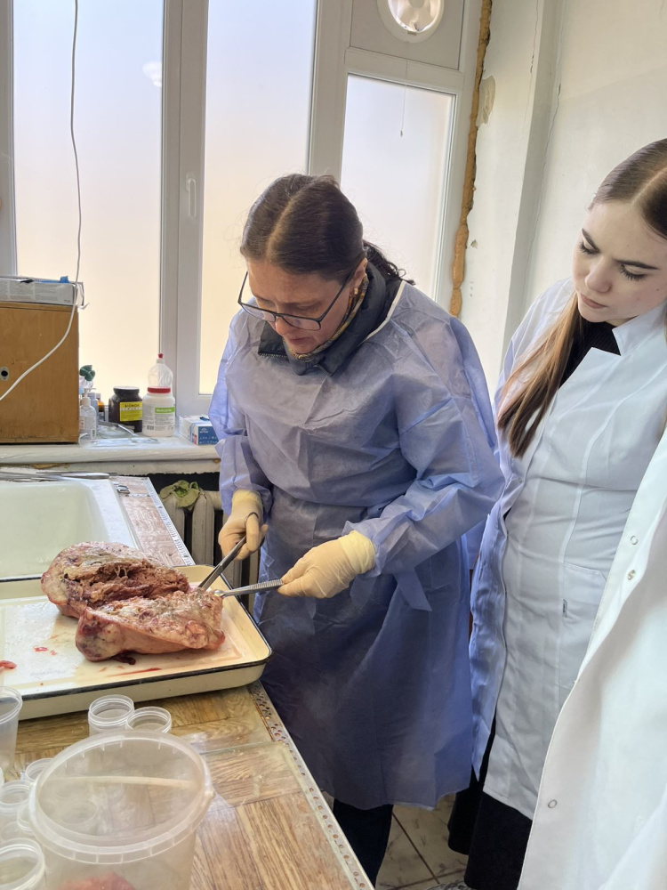 Associate Professor of the Department Remnyova N. O., together with the students, conducted a macroscopic study of the surgical material with a detailed explanation and description of pathological changes, followed by a biopsy procedure. This was followed by a discussion of interesting cases, their morphological analysis, examination of the microscope slides, and the algorithm for forming a pathoanatomical diagnosis.